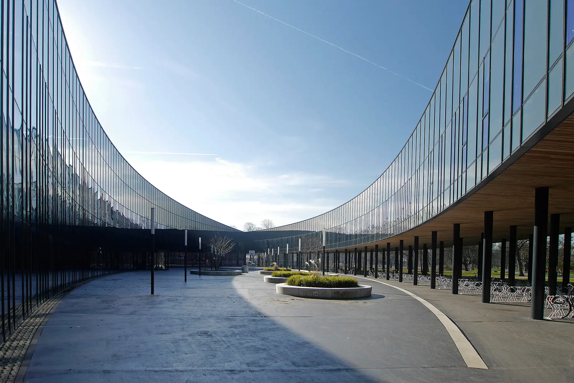 De transparante gevels voorzien van verticale banen met zwarte PV-panelen die wij in opdracht van Wijnen Bouwgroep plaatsten, springen meteen in het oog. De PV-panelen fungeren niet alleen als energie-opwekkers, maar vormen ook nog eens een passieve zonwering én verlevendigen het gevelbeeld.