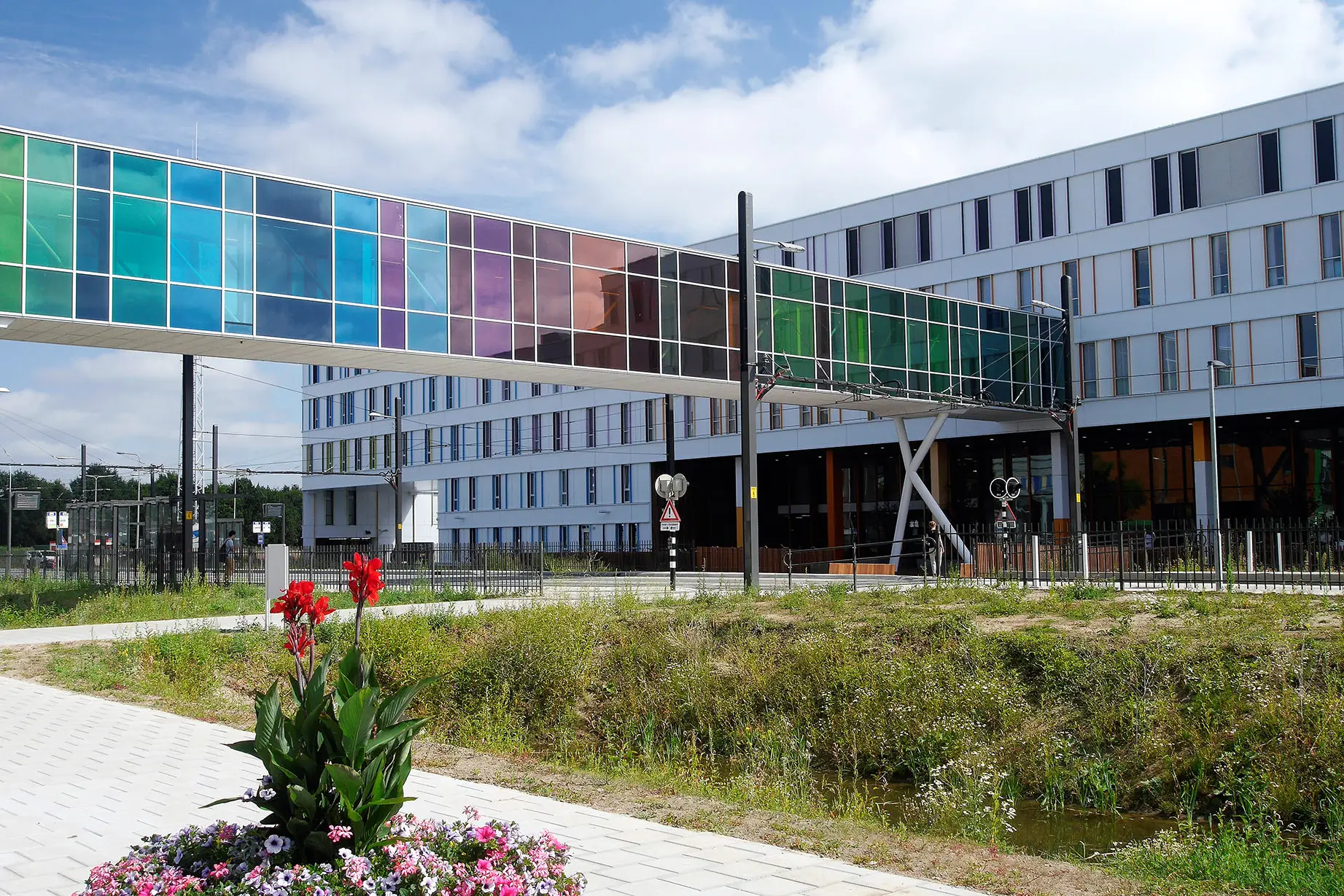 De transparante gevels voorzien van verticale banen met zwarte PV-panelen die wij in opdracht van Wijnen Bouwgroep plaatsten, springen meteen in het oog. De PV-panelen fungeren niet alleen als energie-opwekkers, maar vormen ook nog eens een passieve zonwering én verlevendigen het gevelbeeld.